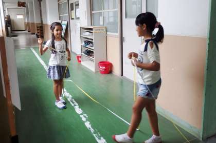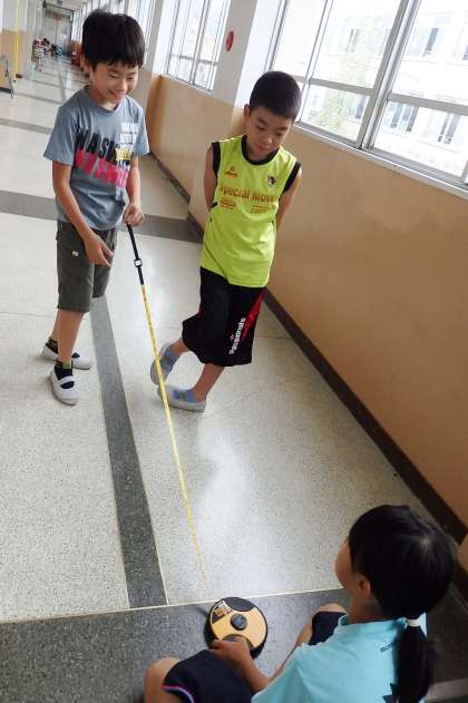 運動場だけではなく,校舎の中を測っているグループもありました。廊下の緑色の所だけや柱と柱の間,渡り廊下の長さなどそれぞれ思い思いの所を測っていました。中には,いくつかの巻き尺を組み合わせて,とても長い距離を測ろうとしたグループもあったりと,とても楽しそうに活動をしていました。