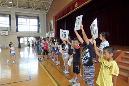 お話の後は,町別に分かれます。大勢の中を自分の町別のところに動くのは,まだ町別の動きに慣れていない低学年の子にとっては大変です。班長・副班長の子が率先してリーダーシップをとって,他の学年の子を誘導してくれました。