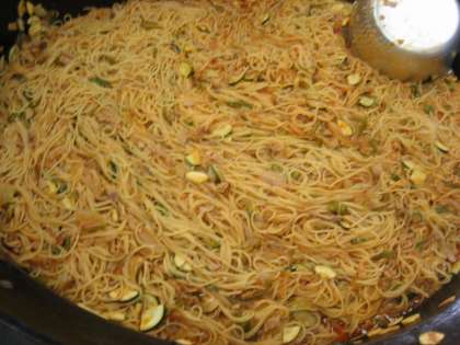 「イタリアンスパゲティ」は、にんにくをオリーブオイルで香ばしく炒めた油にハムを炒め、玉ねぎ・ホールトマトを炒めてケチャップや調味料を加えて調味し夏野菜のズッキーニ・ピーマンを加え、最後に茹であがったスパゲティに絡めて仕上げました。