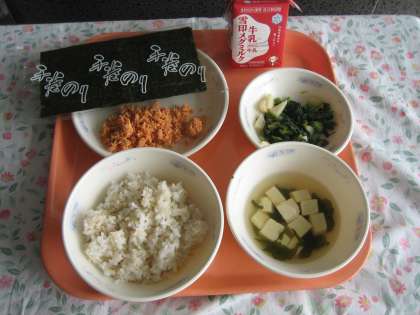 麦ごはん・牛乳・セルフおにぎりの具(うめさけ)・かまぼこと小松菜のいためもの・すまし汁・手巻きのり