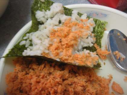 「セルフおにぎり」はおさらの上で、手巻きのりの上にスプーンを使ってごはんをのせて、うめさけのおにぎりの具をのせて自分で巻いて食べる献立です。自分でごはんや具の量を調節しながら楽しんでいただけました。