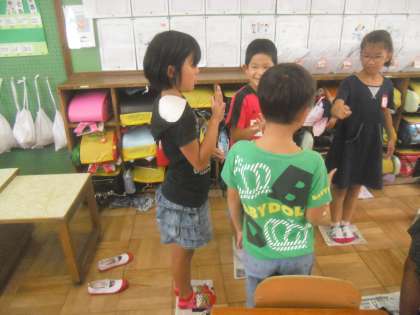 昼休みはたてわり遊びでした。NさんもIさんもそれぞれのグループで新聞ジャンケンをしていました。広げた新聞紙の上に立ってグループでジャンケンし、負けたら新聞紙を半分に折っていくという遊びです。負けが続くと新聞紙が小さくなって立てなくなったらアウトです。こんな遊びですが結構汗をかくようです。「おもしろかった〜」と言いながら汗だくでした。