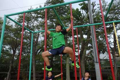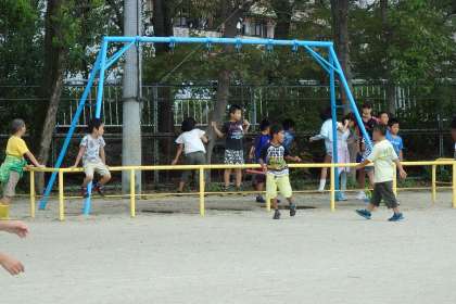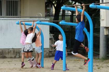 運動場ではブランコや上り棒など,遊具遊びでのんびりゆったり。グループで固まりながら,思い思いの遊びをします。
