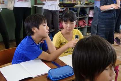 今回の授業でも,隣同士で話し合いをして考えを深め合う「ペアトーク」が多く取り入れられました。「隣同士で話し合ってみましょう」と言う先生の合図に合わせて,全員が積極的に隣との話し合いを始めていた様子を見て,「とても仲のいいクラスなんですね!」と先生方から感心される場面もありました。