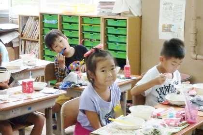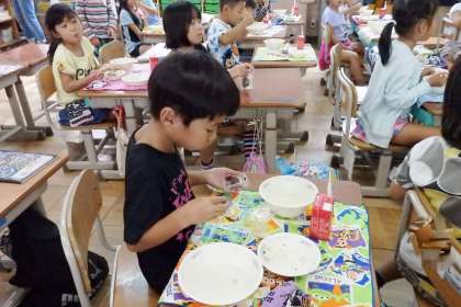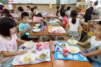 9月2日から新しい食器『PEN食器』での給食が始まりました。何年もの間ずっと使われ続けていた金属の食器とのお別れは,名残惜しいものがありましたが,新しい食器に給食を載せて並べると,見た目にもぱっと華やかに感じられます。PEN食器には京都市の花があしらわれていて雅な印象です。