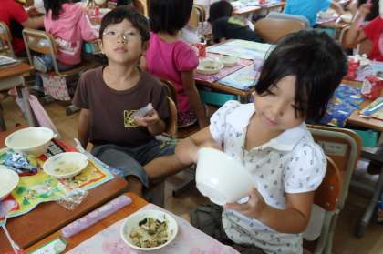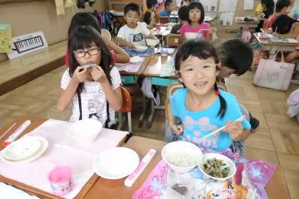 写真を撮ったのは,木曜日の給食時です。この日はなんと給食で初めてのデザート『おはぎ』がつきました。日本の行事,お彼岸にちなんで出されました。今はなかなか和菓子を食べる機会が少ないようで,「あんこは苦手……」という子や「こんなん食べたことない」と,おそるおそる口にする子もいましたが,食べ始めると「意外といける!」と嬉しそうに笑顔を見せてくれました。