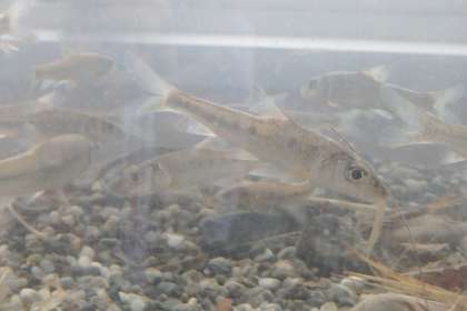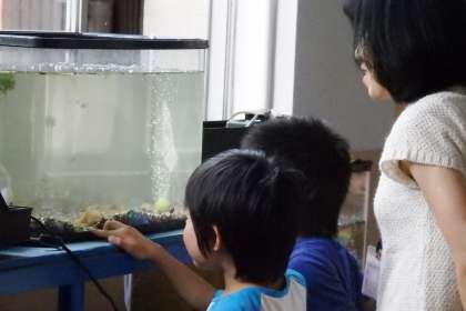今日の校外活動で1年生・2年生がたくさんの魚を捕まえてきました。みんなとても嬉しそうに,「これは僕が捕まえてん!」と話してくれました。今は理科室前の,どじょうの水槽に一緒に入っています。群れで泳いでいるスラッとした魚や,小さくてちょこちょこ泳いでいる可愛い魚など,たくさんの種類が入っています。何と言う種類の魚なのか,またみんなでじっくり調べてみたいですね。