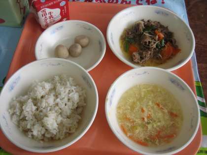 麦ごはん・牛乳・牛肉のしぐれ煮・里いもの煮つけ・キャベツのかきたま汁
