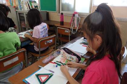 今,3年生は三角形の勉強をしています。2年生では三角形の形や,辺・頂点などの名前を学習しましたが,3年生では「二等辺三角形」「正三角形」など,もう少し具体的な名前も出てきました。今週末からは角度の学習にも入っています。