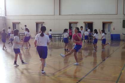 曲は敬老福祉祭りで踊った『Heavenly Star』に加え,去年度に作った『Clap!Clap!』という元気な曲も踊ります。曲は同じですが,運動場に合わせて隊形を少し変えていますので,明日の発表も楽しみにしておいてください!