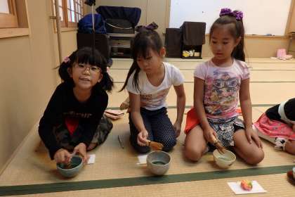 2・3年生は今回からお楽しみのお抹茶とお茶菓子のお作法も練習しました。お茶菓子は真ん中を残してとる,お茶菓子をとる前に「御先で御座います」と挨拶する……など,基本的なことを学びます。
