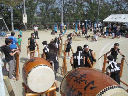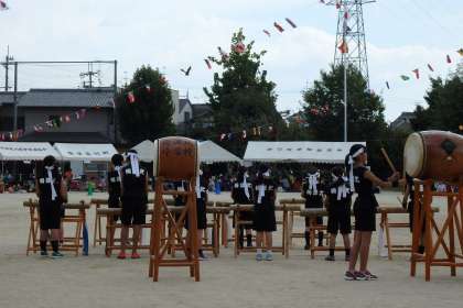 竹太鼓部も区民運動会のお昼の休憩時間に出演しました。揃いの衣装と鉢巻きで,きゅっと気持ちを引き締めて,いざ演奏!力強い太鼓と高い音色をあげる竹太鼓の音が,運動場中に響き渡って,すごい迫力です。「そーれ!」という子どもたちの掛け声も大空に響き,とても印象に残る出演となりました。