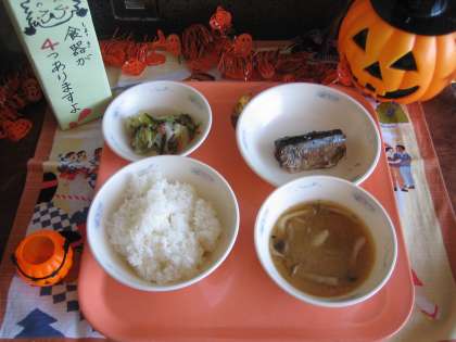 ごはん・さんまのしょうが煮・しば漬け野菜・いものこ汁