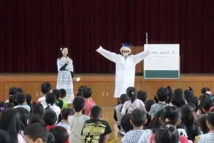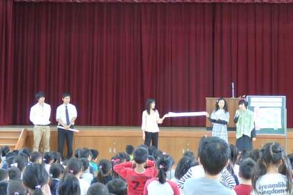 今日の前期終業式にも,算数の星から特別ゲストがやってきました。今日は「わくわく算数」の問題の答えと正解者の発表をするためです。今回は学校の先生も前に出てきて,色々な答えの求め方を考えます。今回は5年生の子が手を挙げて,みんなの前で正しい答えの求め方を紹介してくれました。