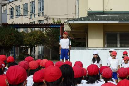 選手宣誓や,開会の言葉なども通して行います。スローガンや言葉の内容は本番までお楽しみです。これらは運動会の運営委員さんが担当してくれています。旗をあげたり,校歌を歌う練習も行いました。