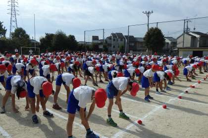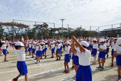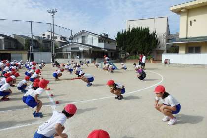 今日の全校体育では,準備体操のダンスも踊りました。ダンスの列に広がる練習から順番に行います。最初は掛け声の声も小さめでしたが,2回目を踊った時には「へい!」「バキューン!」の掛け声も大きくなって,元気いっぱいに,楽しく踊ることができました。