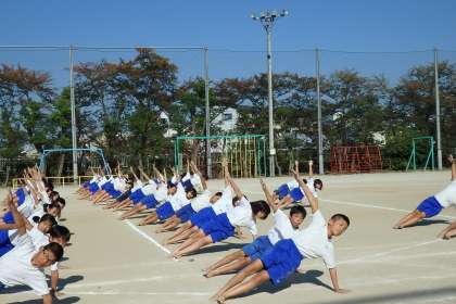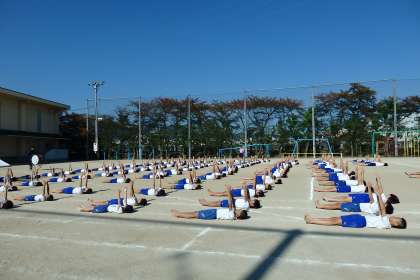 1人技〜2人技のようすです。全体の動きがピタッとそろっていて,とても美しい技です。時間差で行う技や,向きを変えての技にもご注目ください。