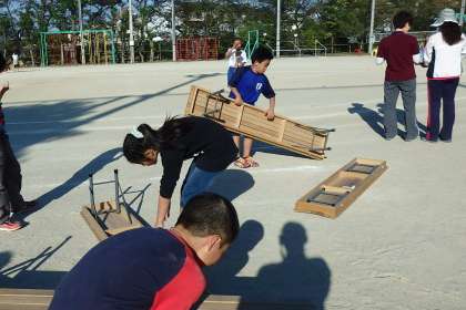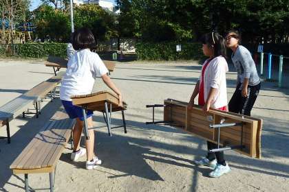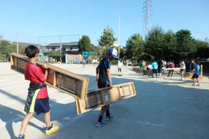 まずは体育館から運動場へ,どんどん長椅子を運び出します。運び出した長椅子は敬老席や保護者席,低学年の座席へ使われます。その数なんと,約100脚!パワーのある子は1人1つを担いで運動場へ向かってくれました。