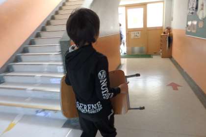 必要なものはあっちこっちから。体育館から運ぶ長椅子の他にも,教室から机や椅子を持ち運ぶことも。校舎から運動場までは距離がありますが,頑張って運んでいきます。