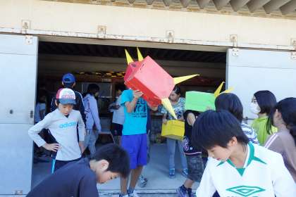 準備係の子どもたち。競技に必要な物を一ヵ所にまとめておきます。倉庫から運び出しているのは鬼の面でしょうか……?一体どの学年がどんな競技で使うのか,楽しみになります!