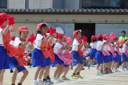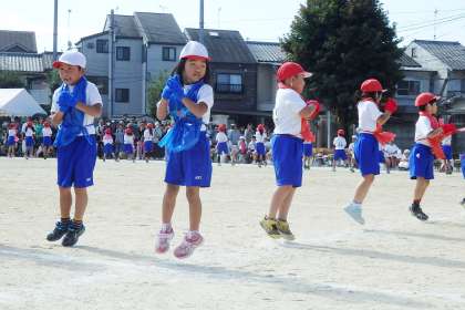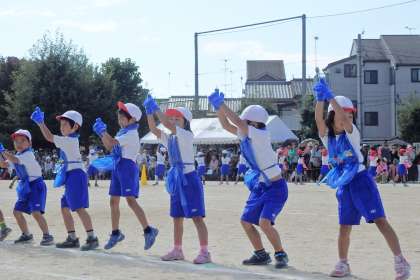 1年生のニンニンダンスです。手裏剣をつけた忍者の恰好で,とんだり跳ねたり元気いっぱいに踊ります。可愛らしい姿に思わず笑みがこぼれます。