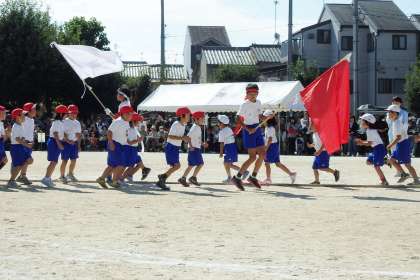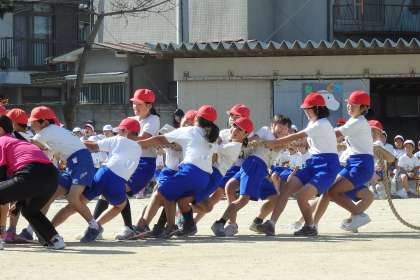 色対抗綱引きです。午前中は1・3・5年生の勝負となりました。入場は,それぞれ応援団長に引き連れられて,綱の横に待機します。「よーい,どん!」で引っ張り合いの始まりです!なかなか拮抗した勝負でしたが,2回とも赤組の勝利となりました。
