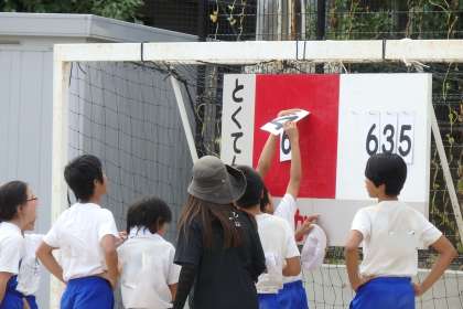 午前中すべての競技が終わり,中間結果発表となりました。結果は……わずか10点差で赤組のリードとなりました。わぁっと歓声を上げて「午後からも頑張らないと!」とはしゃぐ赤組に,「これくらいなら,すぐ追いつける!」と張り切る白組。午後からも張り切っていきましょう!