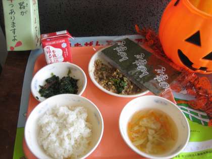 ごはん・牛乳・肉みそ納豆・ほうれん草のおかか煮・キャベツの吉野汁・手巻のり