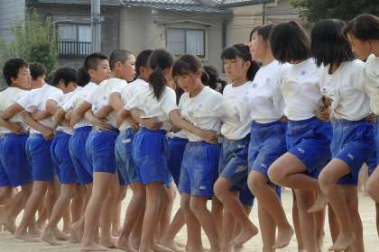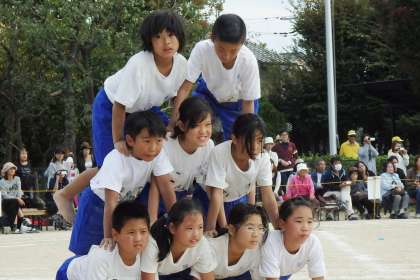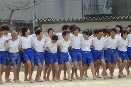 列から回転技へ。全員の息が合わなければ,まっすぐに回転しているように見えません。外側は早足で,内側はゆっくりと……。少しずつ調整しながら回ります。