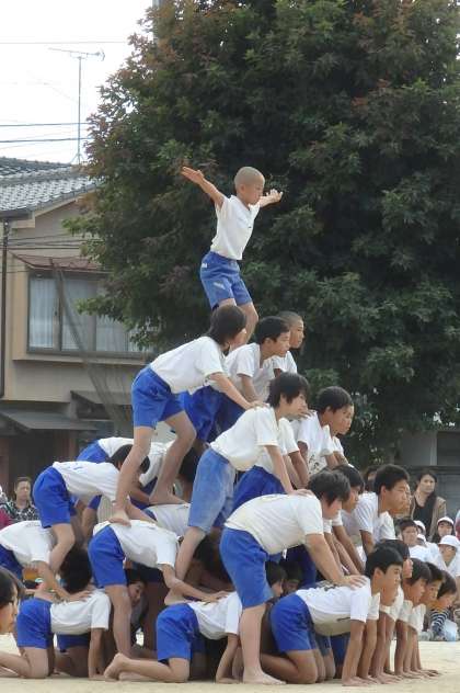そして最後は大技。5年生・6年生それぞれのピラミッドが完成しました!全体から大きな歓声と拍手がわきあがりました!今年もとても素晴らしい組体操でした。