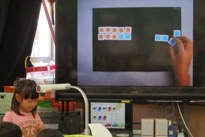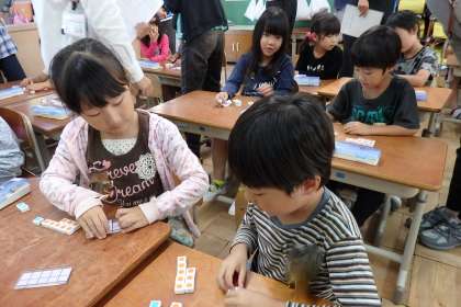 数図ブロックを動かした後は,お隣同士で説明をし合います。たくさんの見本を見た後なので,みんな自分で動かしながら説明できていました。「今日の学習,分かったかな」という先生の問いかけにも,みんな元気よく手をあげていました。