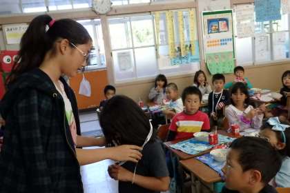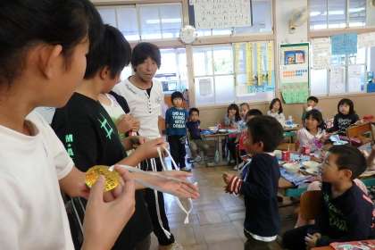 今日のお昼ご飯の時間,図書ボランティアに参加してくれた人にお礼を渡しに行きました。今日は1年生と4年生の教室に向かいます。