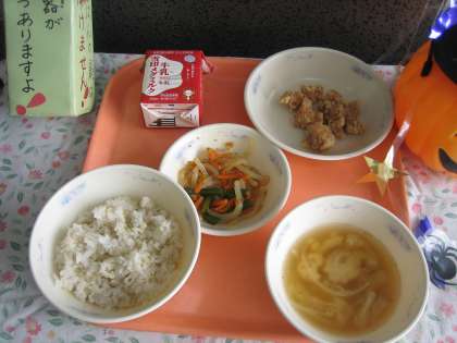 麦ごはん・牛乳・鶏肉のこはくあげ・野菜のきんぴら・みそ汁