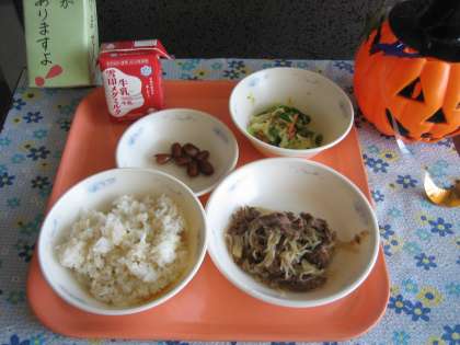 玄米ごはん・牛乳・牛丼の具・金時豆の甘煮・アスパラガスのごま煮