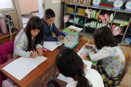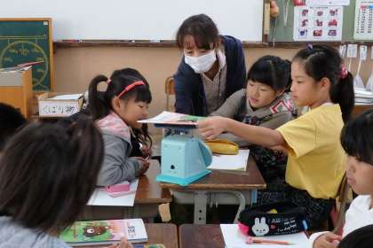 3年生の算数は,重さの続きです。今日ははかりを使って色々な物の重さを調べていきました。まずは,平らな場所に置く,目盛はまっすぐ見る……など,はかりの正しい使い方を学びます。写真は教科書の重さを量っているところです。目盛とにらめっこをしながら,ノートに記録をしていました。