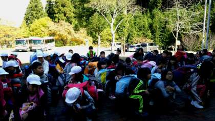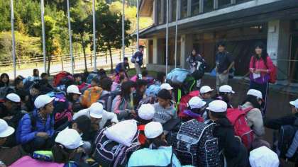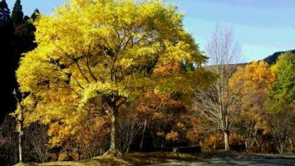 予定通り午前11時ごろに山の家に到着しました。今から到着式に向かいます。桂の大木でしょうか。見事に色づいています。