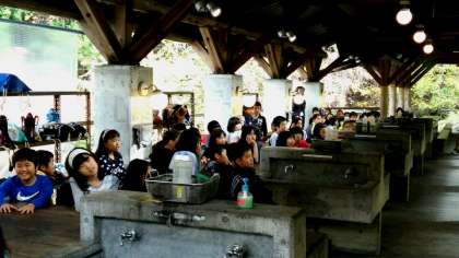 今から魚つかみの活動です。職員さんから説明を受けます。生きた魚をつかまえて,自分でさばいて命をいただく……という説明を受け,子どもの中には複雑そうな表情の子も。
