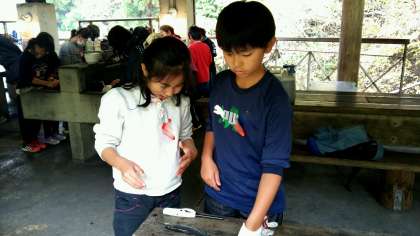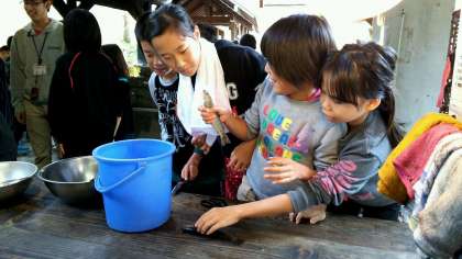 そして,魚の命をいただく時。心を込めて調理して,おいしいおかずにします。ハサミをつかって,しっかりとさばいていきます。