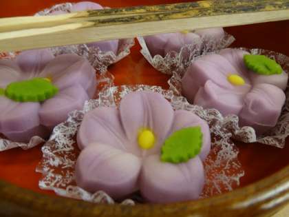 今日の花はツワブキで,和菓子は,ききょうをイメージしたものでした。