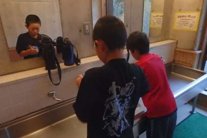 眠たくても,動き始めると目が冴えてきます。歯ブラシに顔洗い,冷たい水で目もパッチリです!