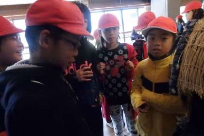 山の家の館内を自由に探索しながら行える館内ラリー。子どもたちの人だかりの中にいるのは,展示されているお人形,通称『花子さん』です。昔の道具や暮らしの展示のため,古くからあるこのお人形。子どもたちの間では色々な話や噂が流れているようです。
