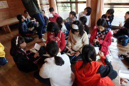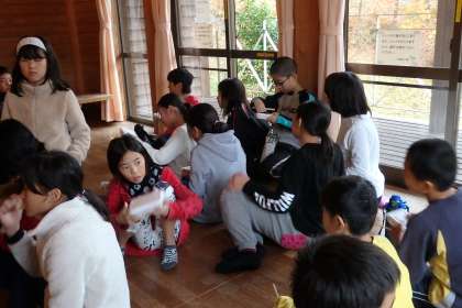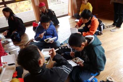 お昼ごはんは1組・2組に分かれて食べました。この後は,キャンプ練習とリコーダー練習に分かれて活動を行います。