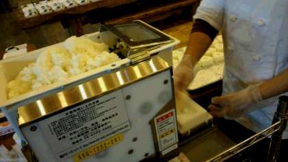ちなみに,とても美味しかった昼食のおにぎりですが,山の家の職員さんがこんなに面白い機械を使って作ってくださっています。この機械,ただおにぎりの形にするだけではなく,ふんわりとした握り具合を出すため,てっぺんでかき混ぜるところがあります。