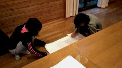 今日の朝で山の家とはお別れです。朝からシーツをたたみ,退所の準備を始めます。写真は女の子達の様子です。1回で合格がもらえるよう、シーツのしわをぴんと伸ばしてたたんでいます。
