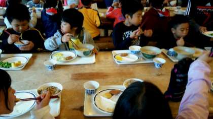 今日の昼食は,豚丼と豚骨ラーメンのどちらかを選ぶことができました。今日も子どもたちの人気はラーメンです!バイキングは和風の煮物。どちらも美味しくいただきました。職員さん,4日間美味しいご飯をありがとうございました!