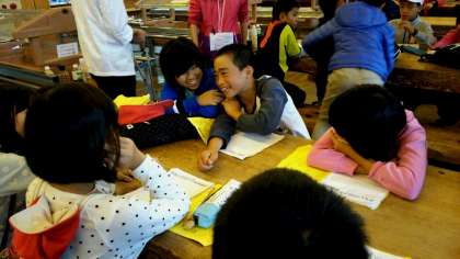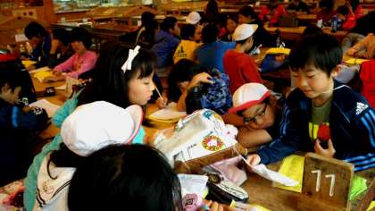 お昼御飯のあとは食堂で最後のふりかえりをしました。4日間頑張ってきた5年生。後もう少しで家に帰れると思うと少し緊張の糸がきれてきたのか,ほっこりとした様子の子も増えてきました。ふりかえりを書きながら大あくび。バスの中ではゆっくりと休んでください。