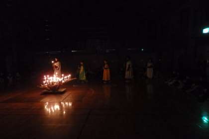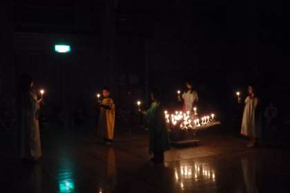 キャンドルファイヤーが始まり,みんなゆっくりと入場を始めます。『遠き山に日は落ちて』を歌った後に,火の神と火の子たちが入場します。火の子たちの4本で,ゆらゆら輝くろうそくの輝きが完成します。