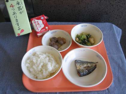 ごはん・牛乳・開干さんまのからあげ・里芋とこんにゃくの土佐煮・おあげとなっぱのたいたん
