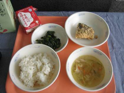胚芽米ごはん・牛乳・さばのたつたあげ・ほうれん草のおかか煮・キャベツの吉野汁