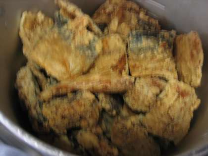「さばのたつたあげ」はしょうが醤油で漬け込んださばを片栗粉と小麦粉をつけて油でカラッと揚げました。